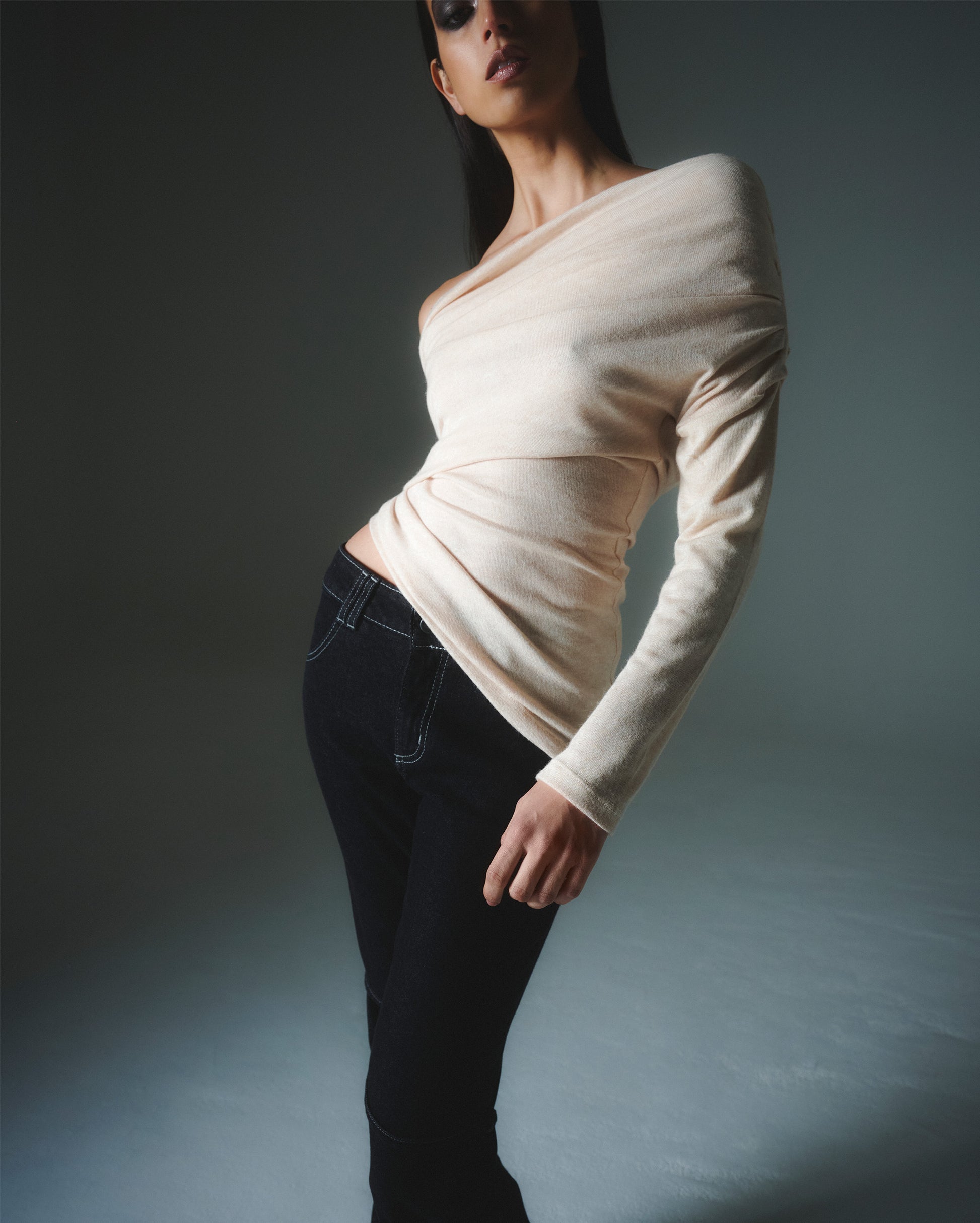 Top confeccionado en tela suave, con diseño off-shoulder y drapeados laterales. Su diseño versátil permite usarlo con uno o ambos hombros descubiertos. Mangas largas y bajo irregular que acentúan el diseño asimétrico de la prenda.